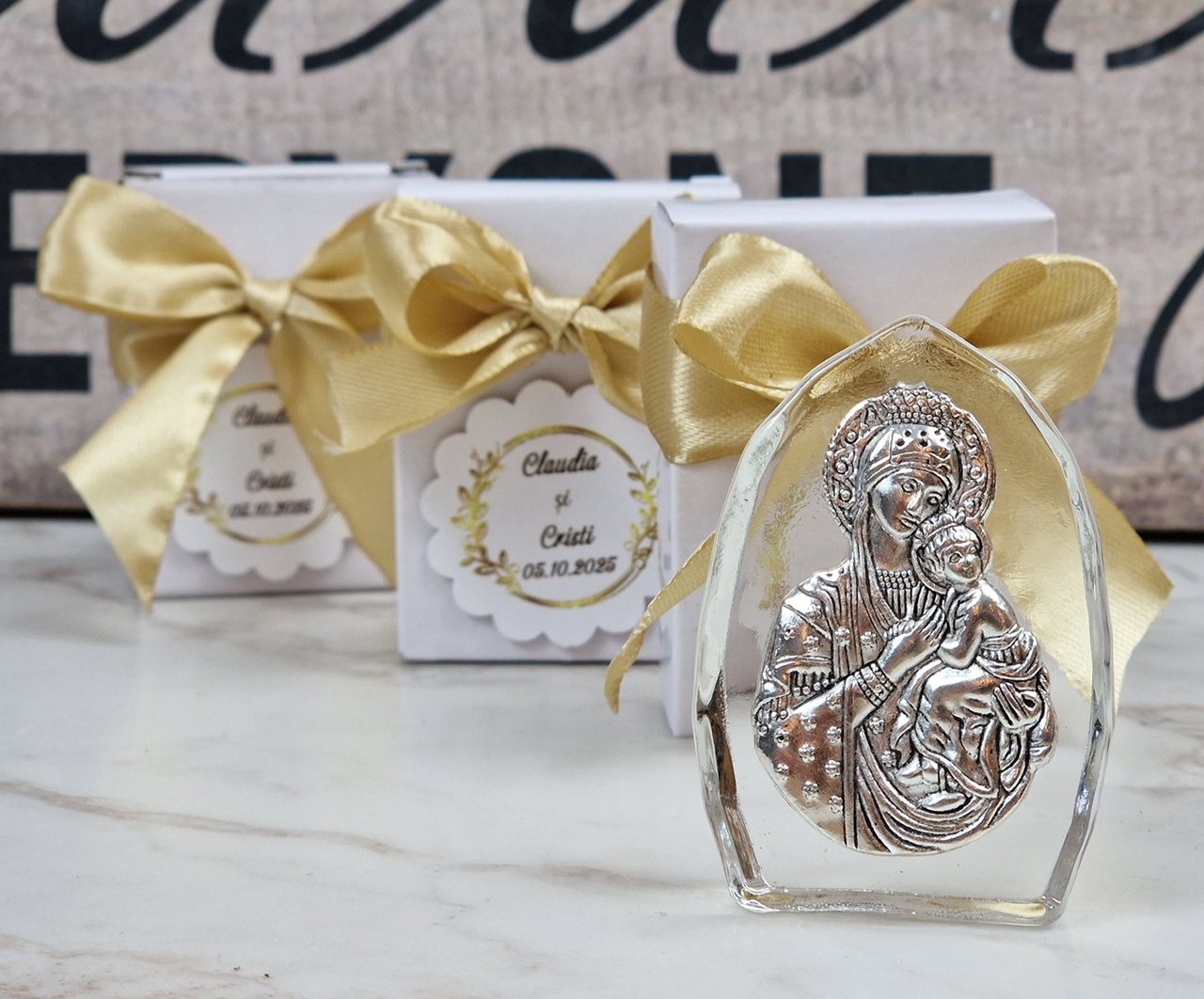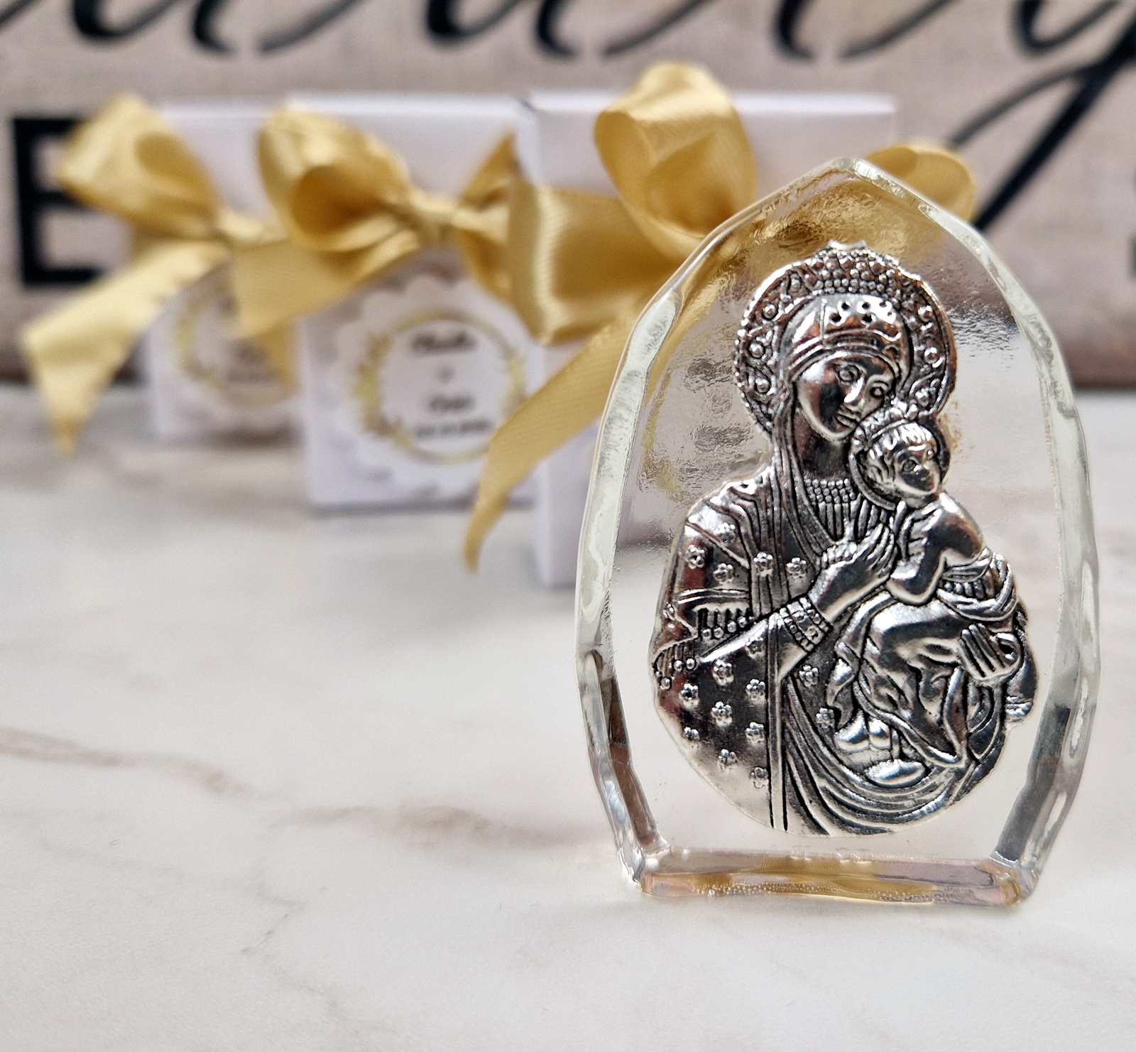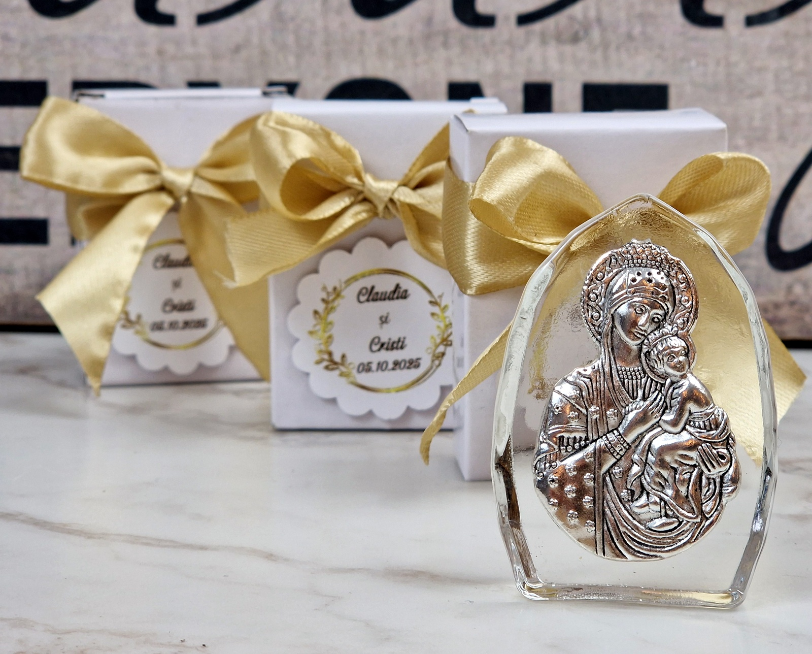 Iconita din sticla cu Fecioara Maria si  pruncul Iisus este o marturie de botez potrivita pentru orice petrecere de botez.