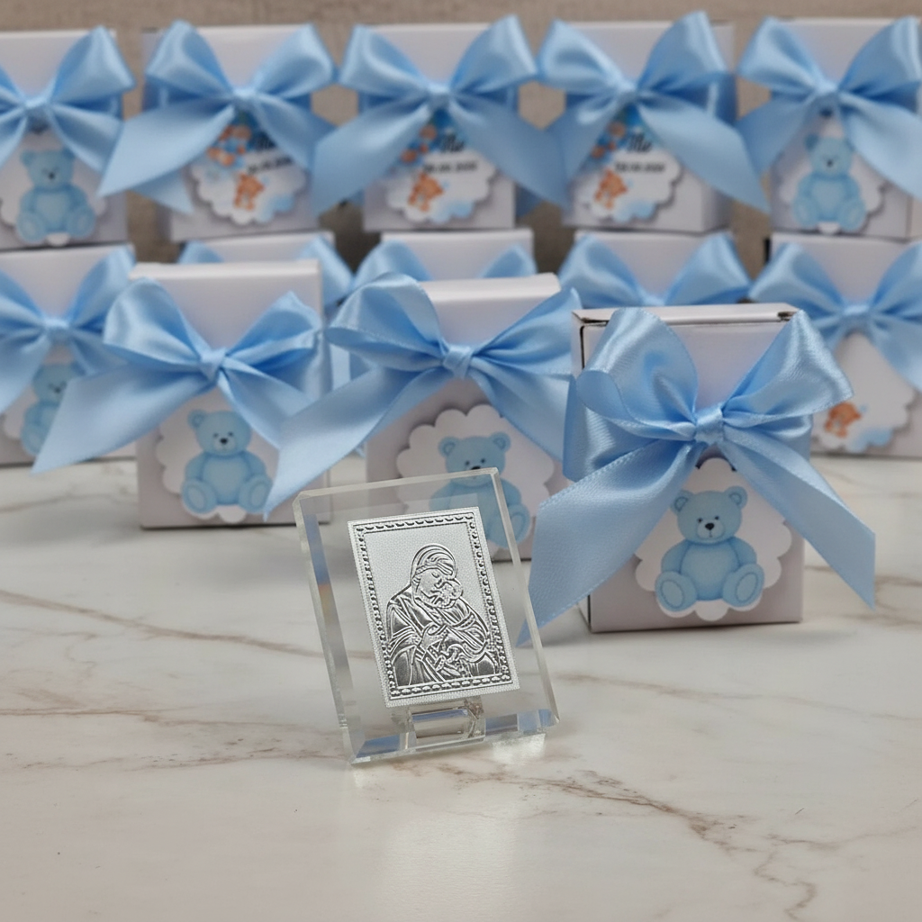 Marturiile iconita se ofera ambalate in cutiute albe din carton sau in saculeti de organza