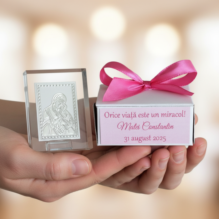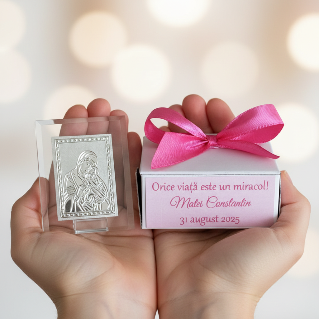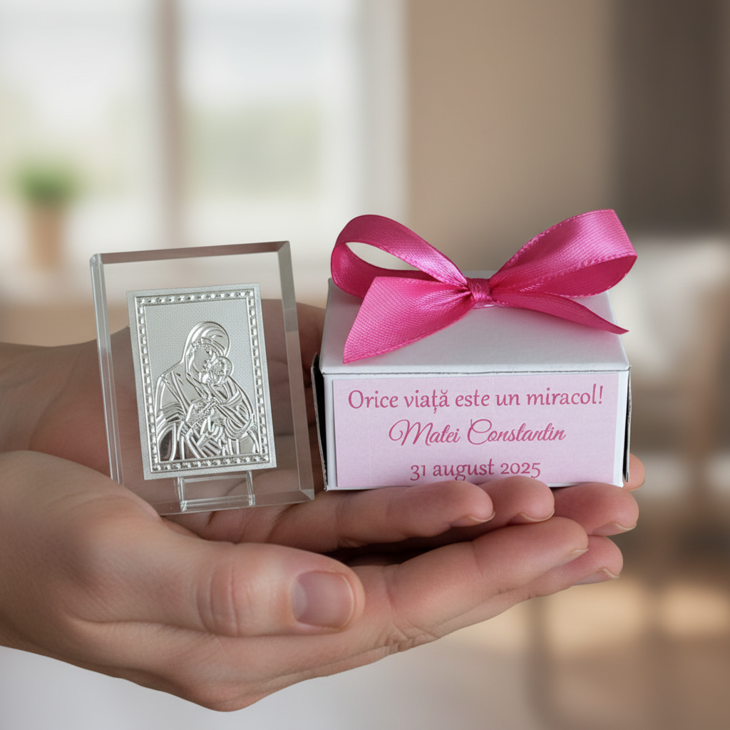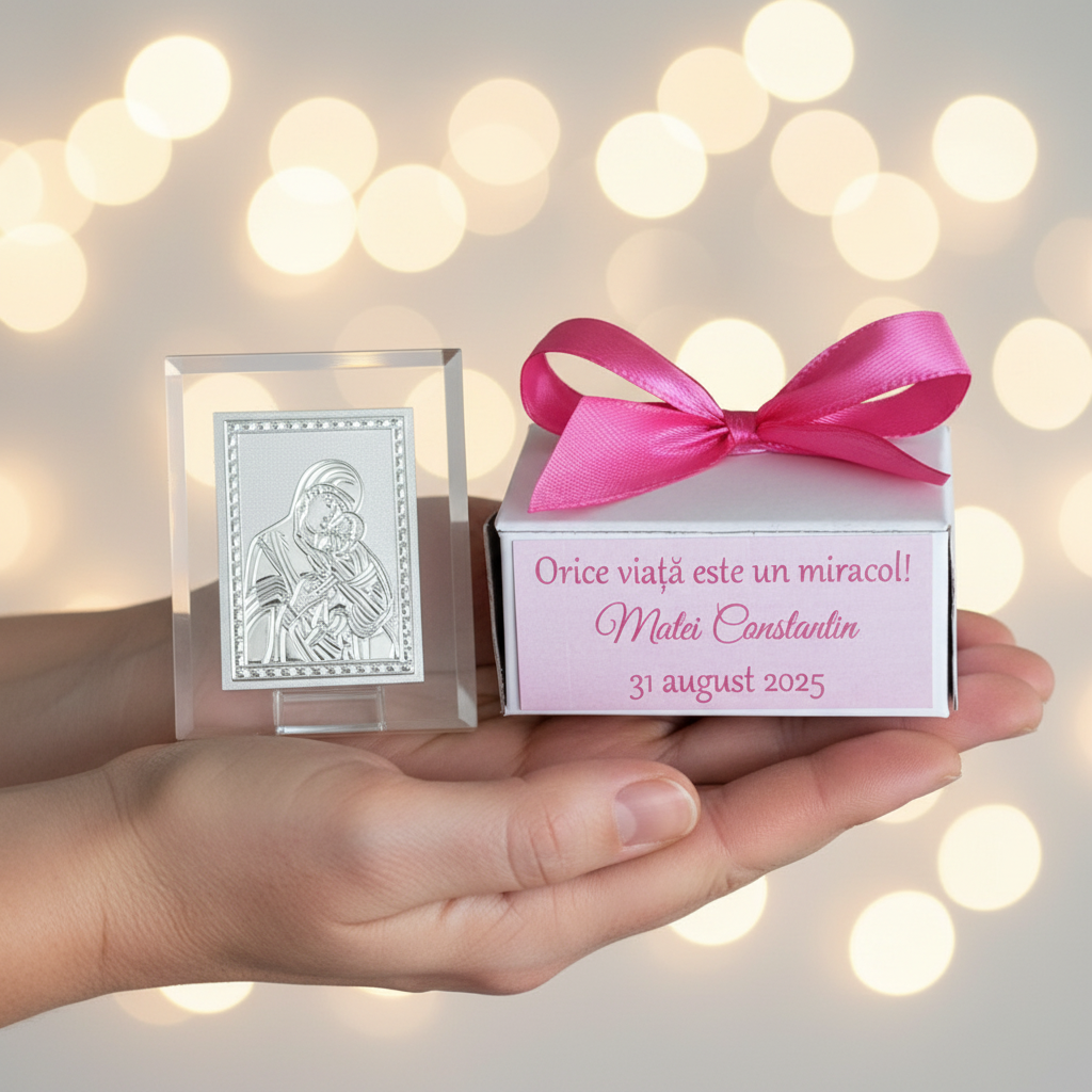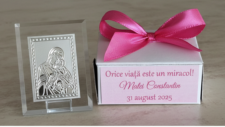 Iconita din sticla cu Fecioara Maria si pruncul Iisus este o marturie de botez potrivita pentru orice botez. Iconita este realizata din sticla iar reprezentarea este din metal