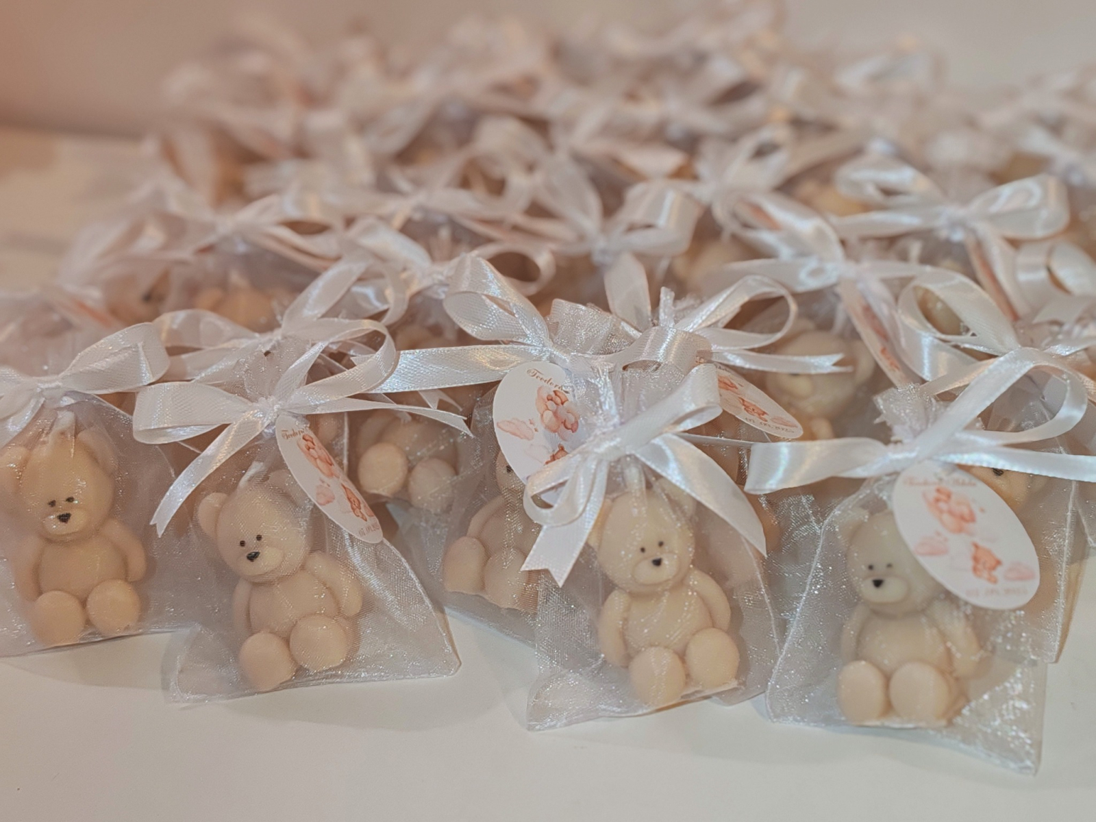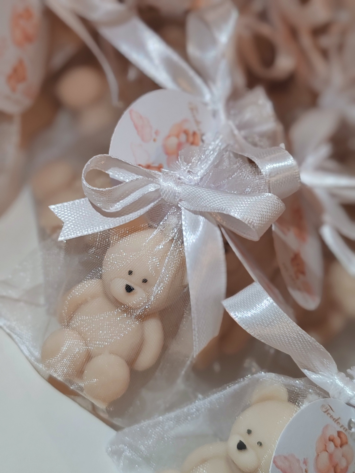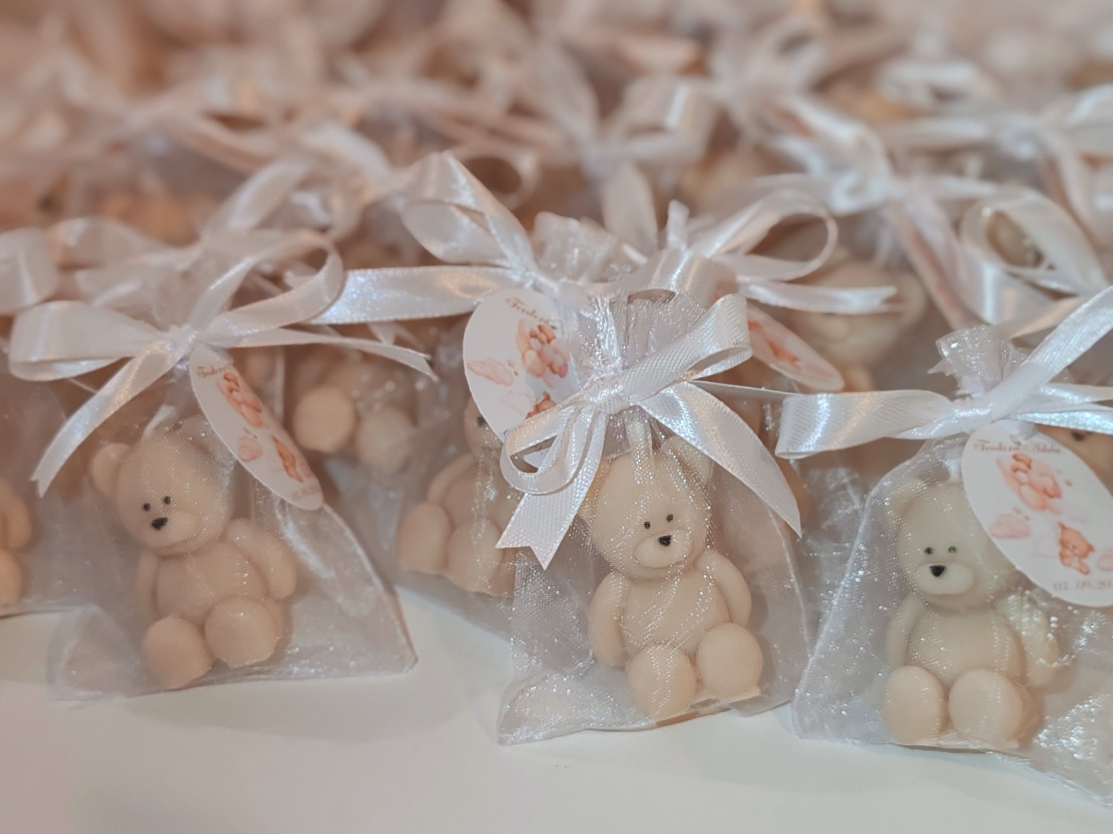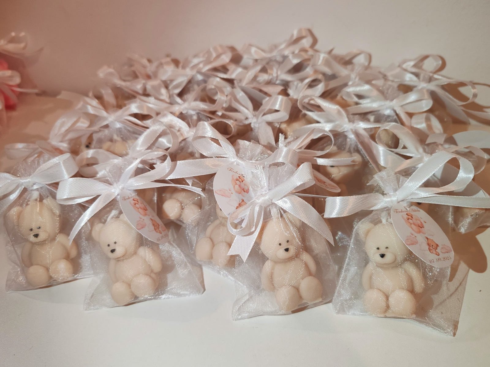 Asamblarea inseamna sa punem ursuletii in saculetul de organza si sa legam eticheta cu o pamblica in forma de fundita.