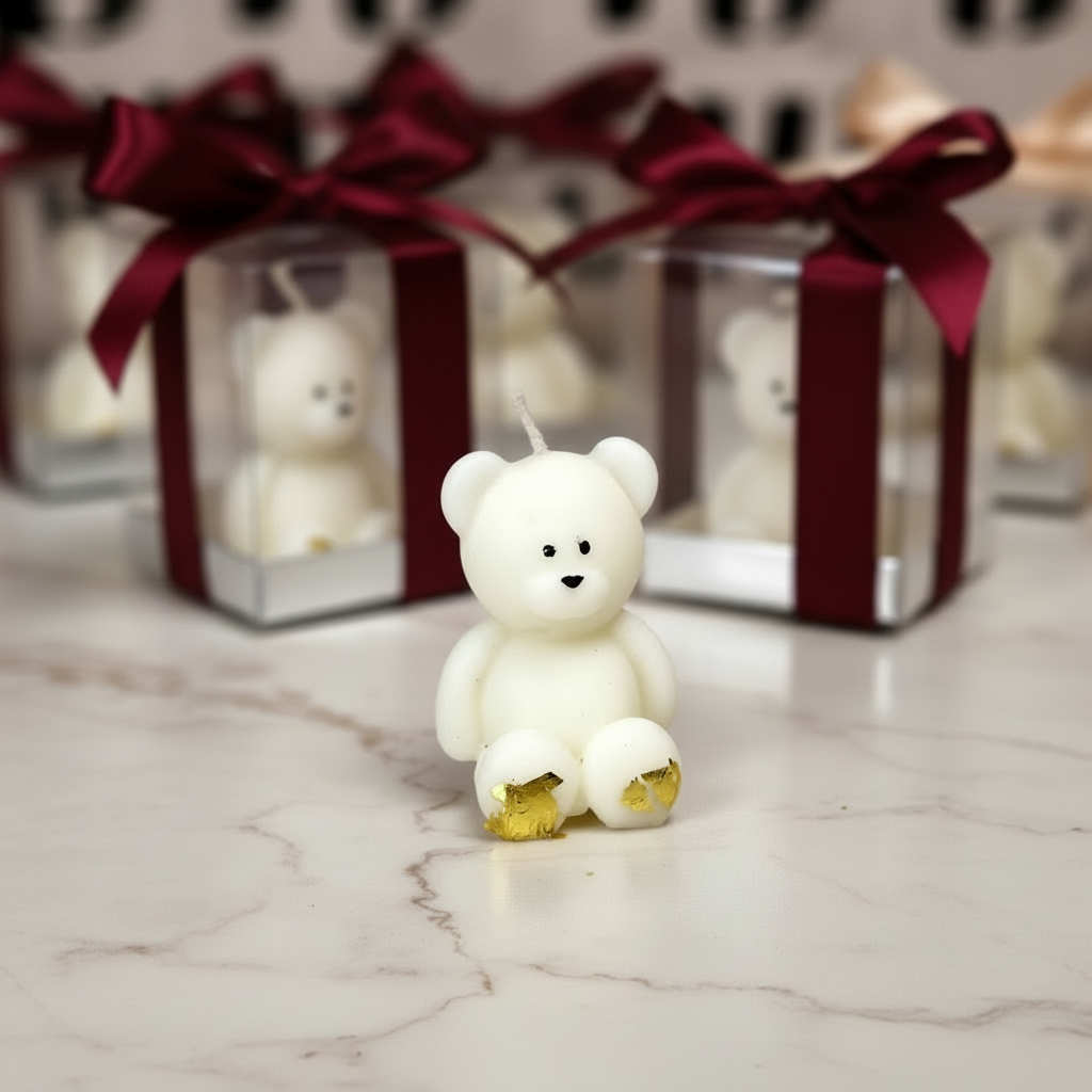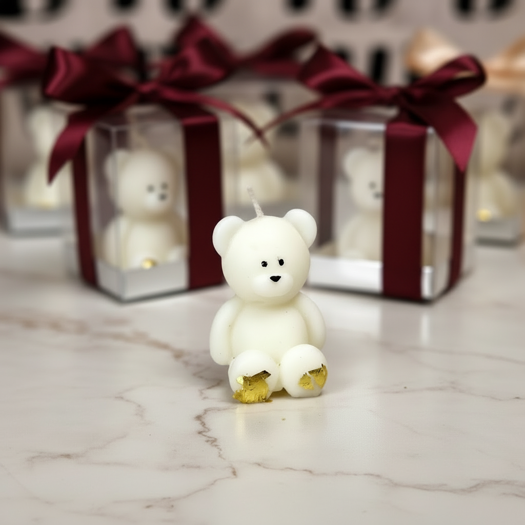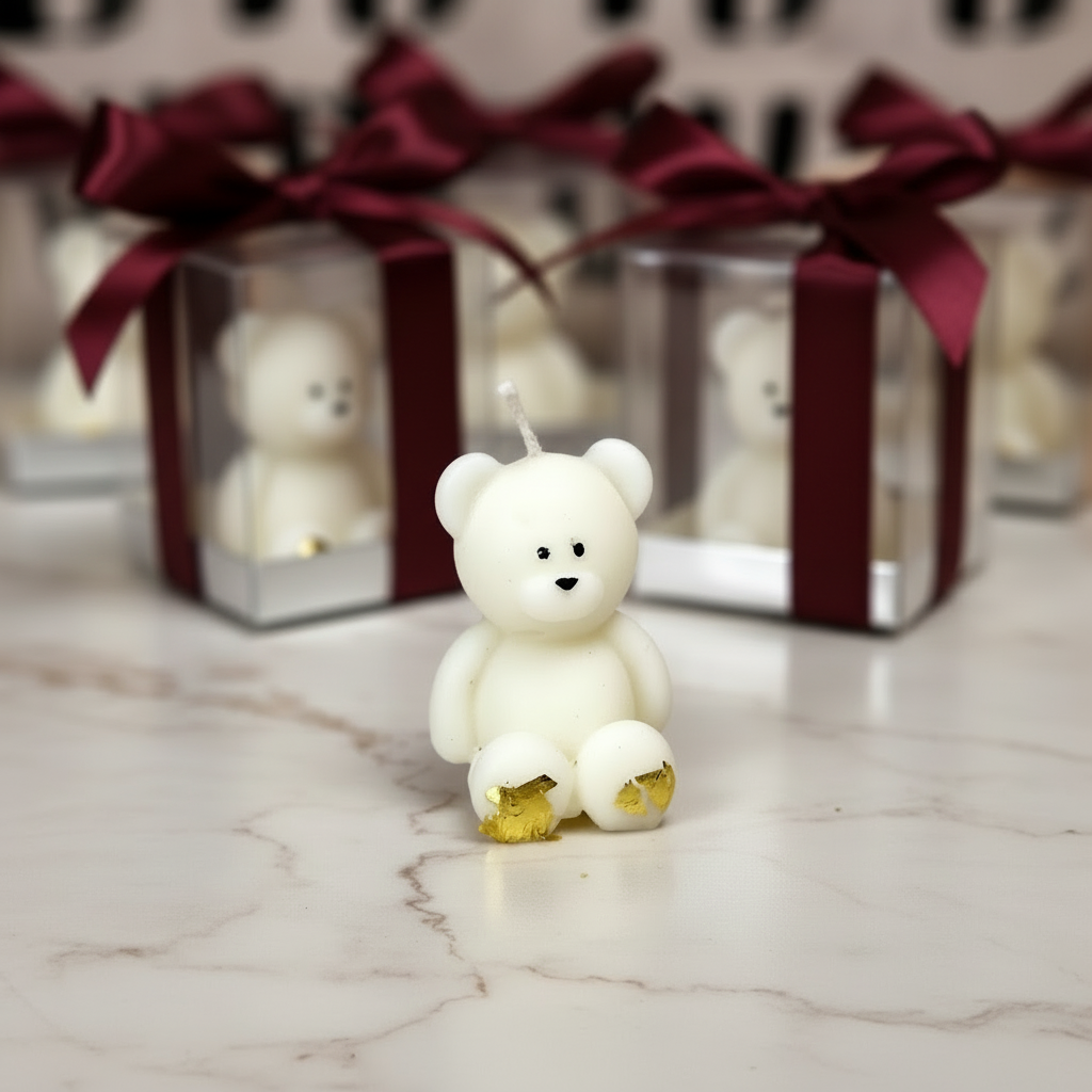 Surprinde-ți invitații cu o marturie de botez speciala - o lumânare din ceara soia in forma de ursulet personalizata si ambalata elegant.