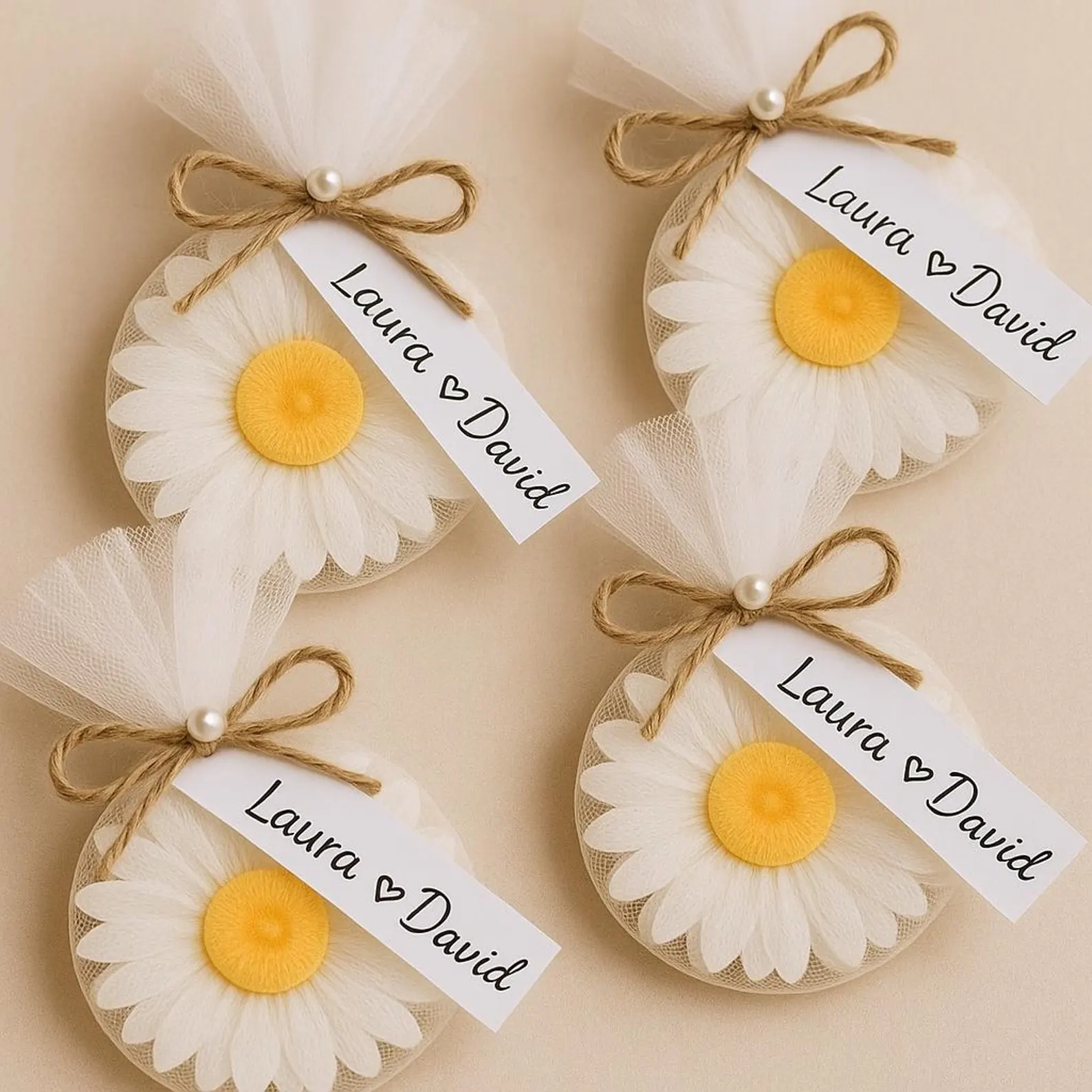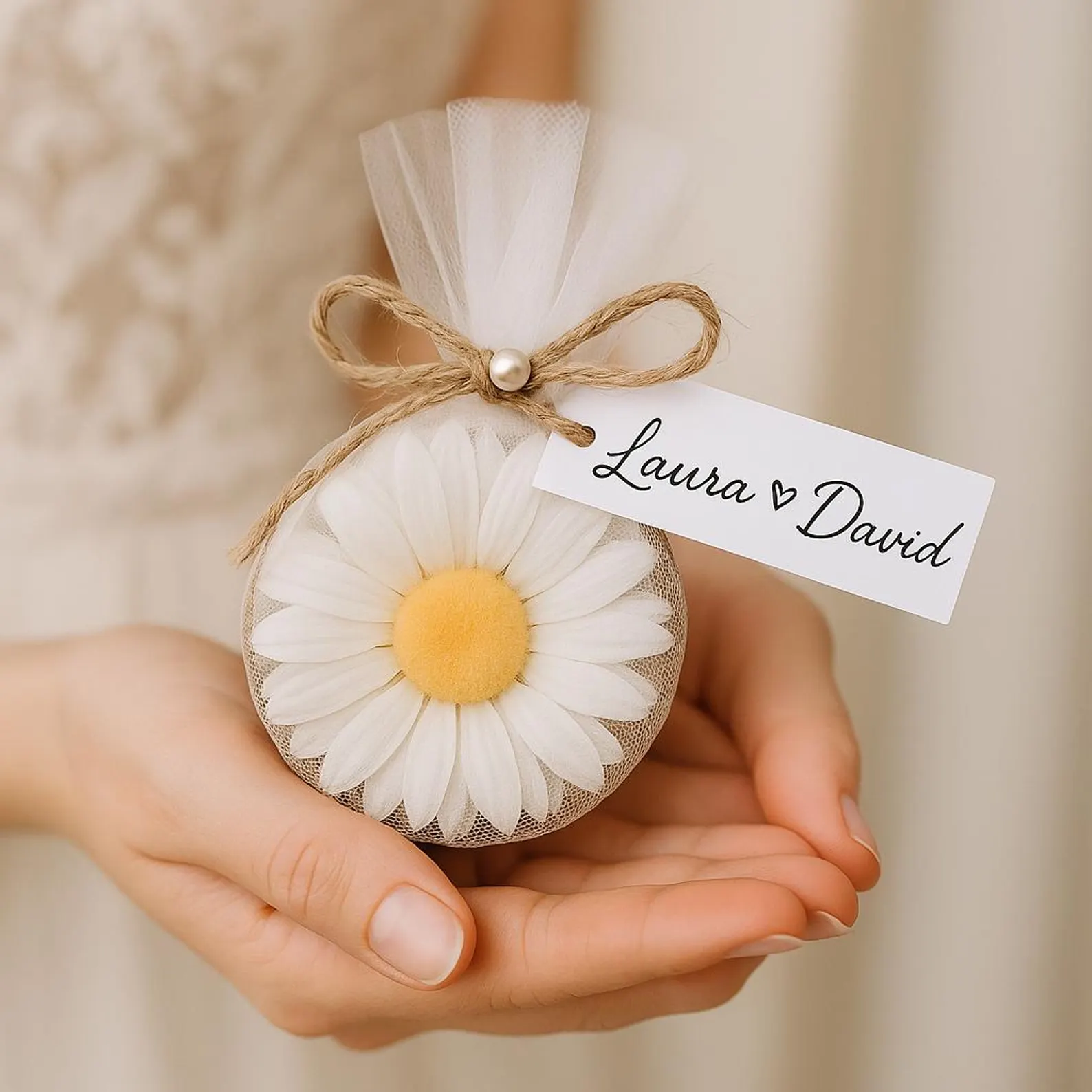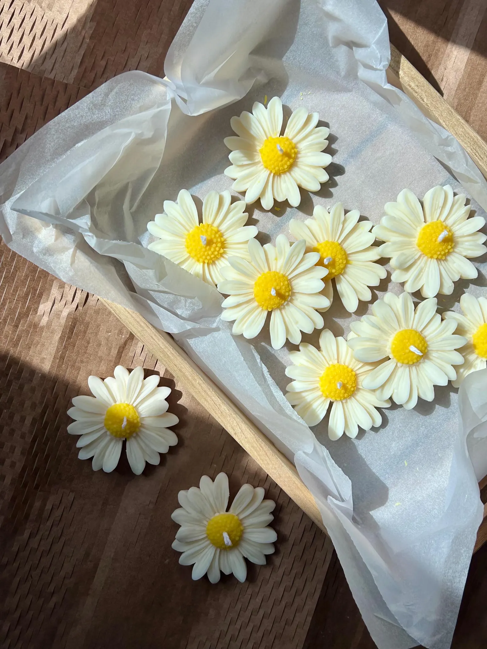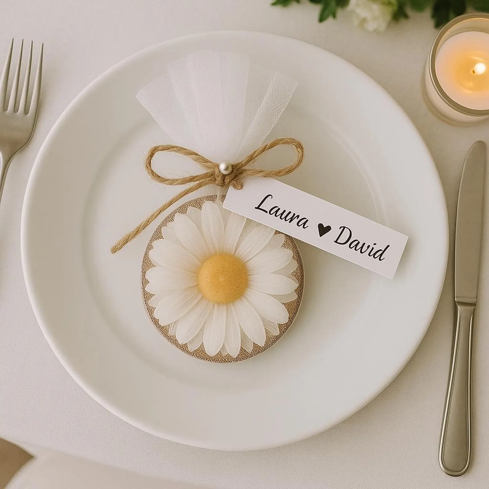 mărturii nunta lumanare in forma de o delicata MARGARETĂ, turnată manual din ceară de soia  cu fitil din bumbac organic.Surprinde-ți invitații cu o marturie de NUNTĂ speciala - o lumânare în formă de floare din ceara soia personalizata si ambalata elegant.