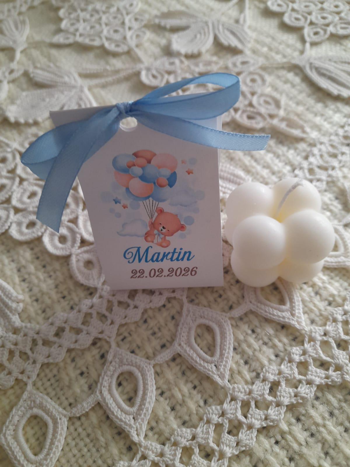 Lumânare mărturie bubble 4×4 cm, turnată manual din ceară de soia  cu fitil din bumbac organic.Surprinde-ți invitații cu o marturie de botez speciala - o lumânare din ceara soia personalizata si ambalata elegant.