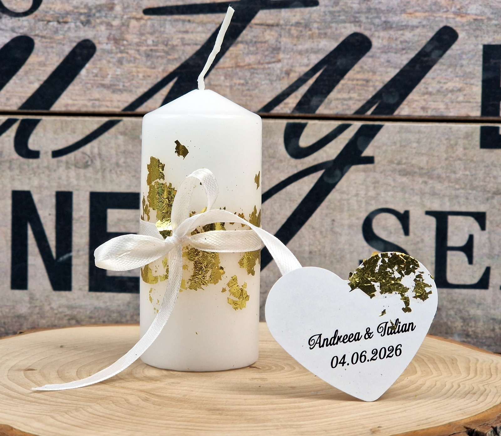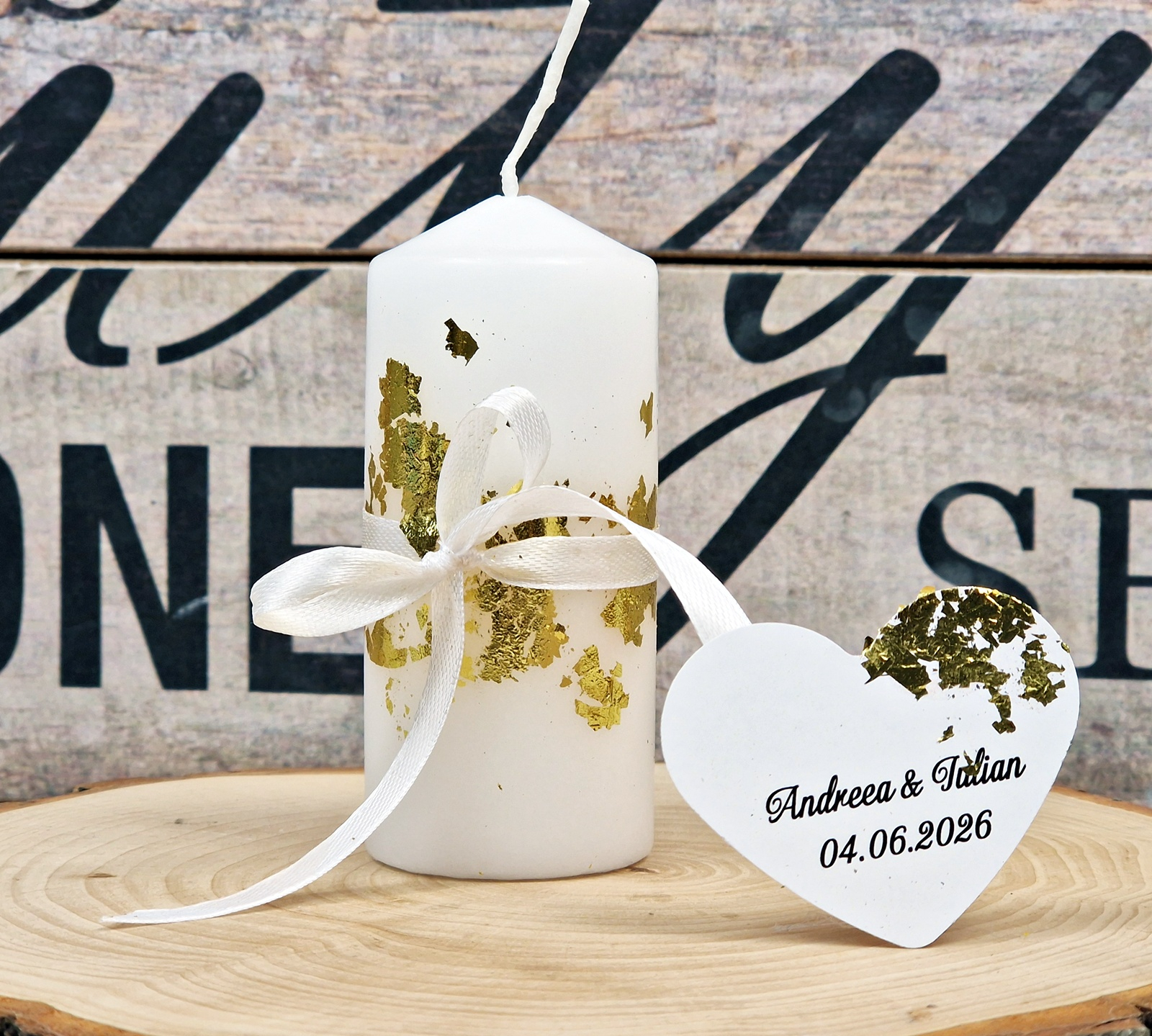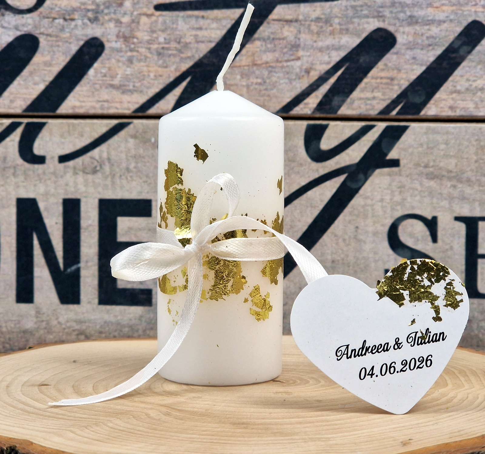 Marturie de nunta sau botez - o lumanare decorata manual cu foita aurie.