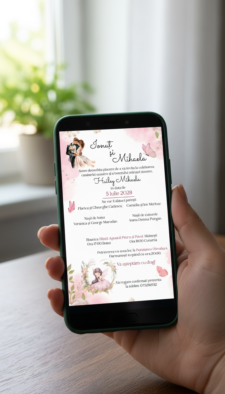 ✨ Invitatiile electronice sunt alegerea ideală pentru a economisi timp și bani! 💸⏳ Le poți trimite rapid și ușor pe Facebook sau WhatsApp, astfel încât toți invitații să fie la curent cu evenimentul vostru special! 💌🎉
