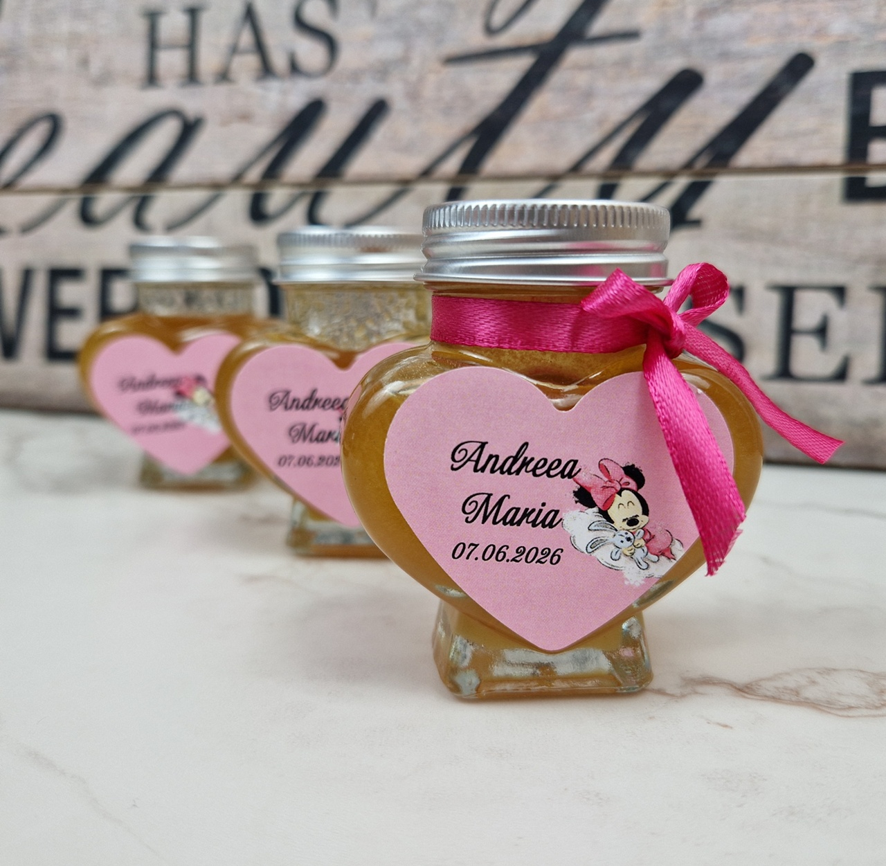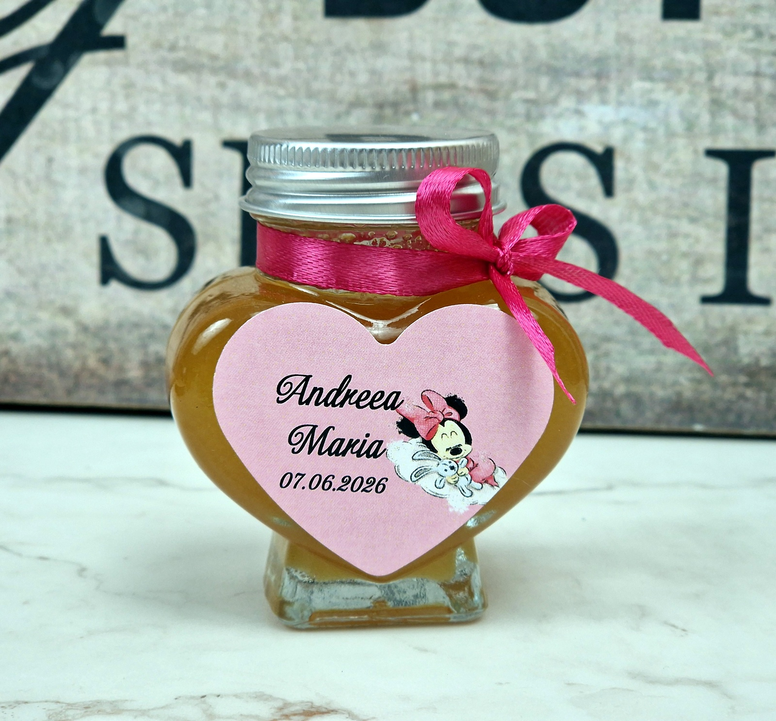 Borcanasul cu miere este accesorizat hartie creponata legata cu o pambica asortata si un trandafiras.