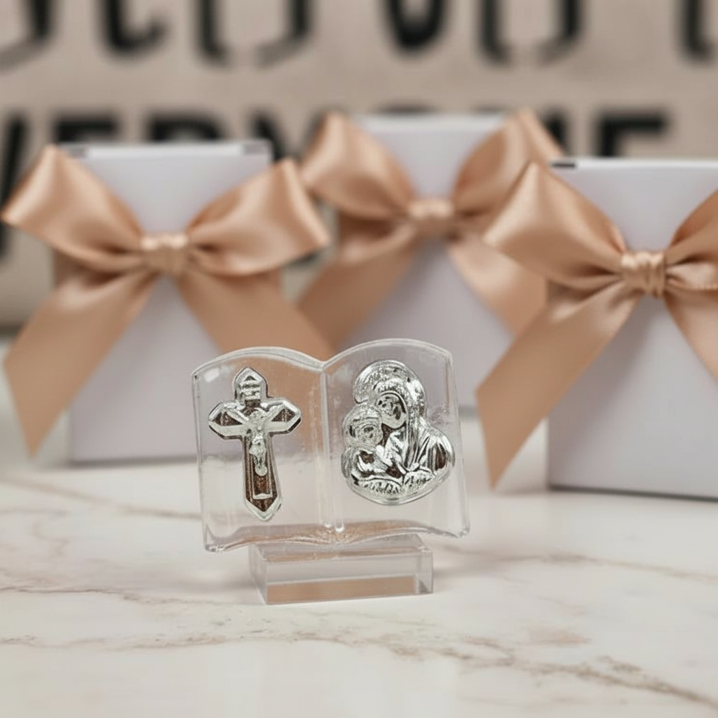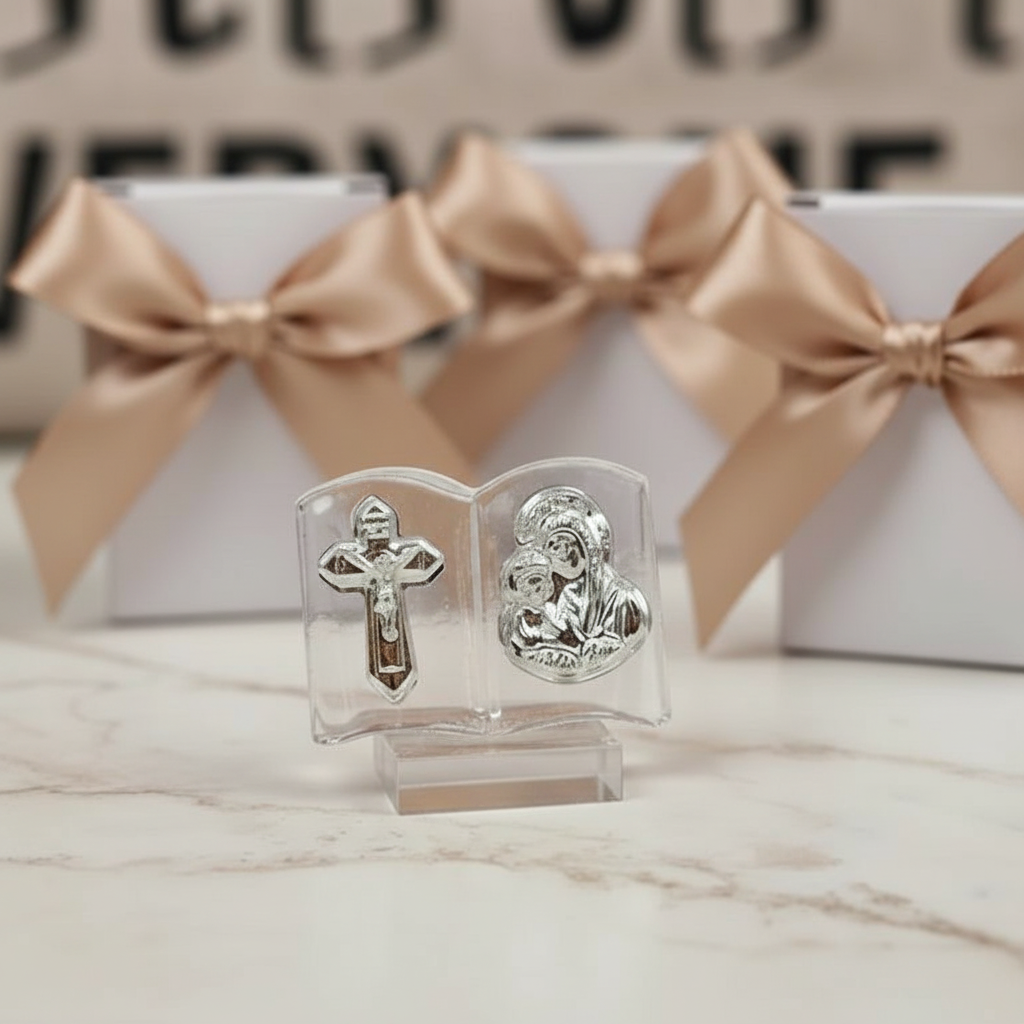 Marturia de botez iconita este realizata dintr-o folie subtire de aluminiu lipita pe sticla. Aceasta are un mic suport de sticla.
