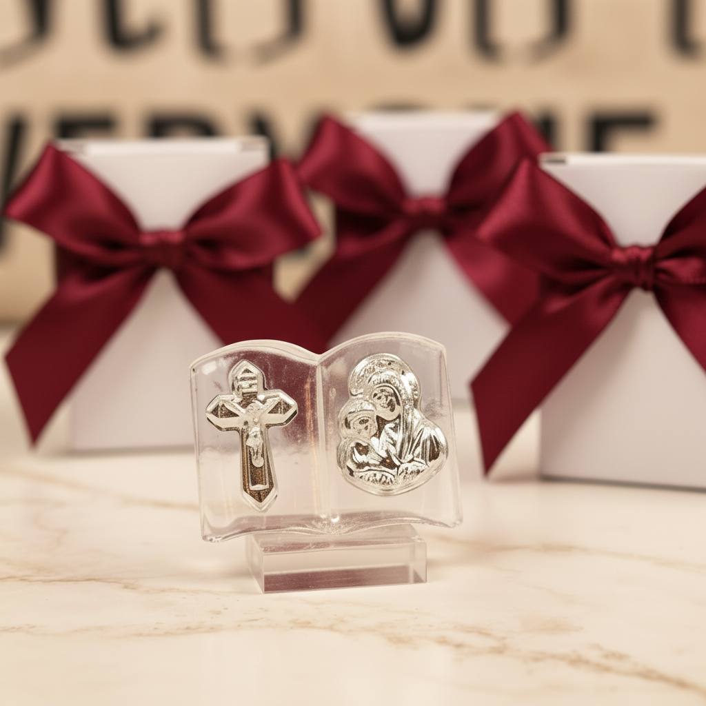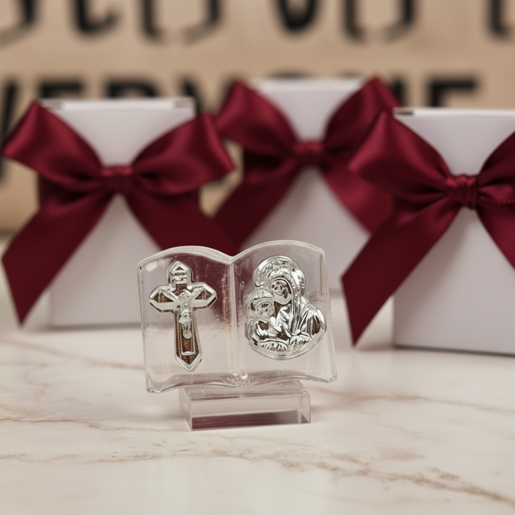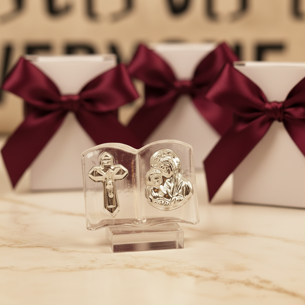 Marturia de botez iconita este realizata dintr-o folie subtire de aluminiu lipita pe sticla. Aceasta are un mic suport de sticla.