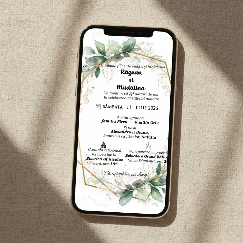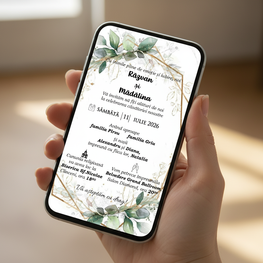 ✨ Invitatiile electronice sunt alegerea ideală pentru a economisi timp și bani! 💸⏳ Le poți trimite rapid și ușor pe Facebook sau WhatsApp, astfel încât toți invitații să fie la curent cu evenimentul vostru special! 💌🎉