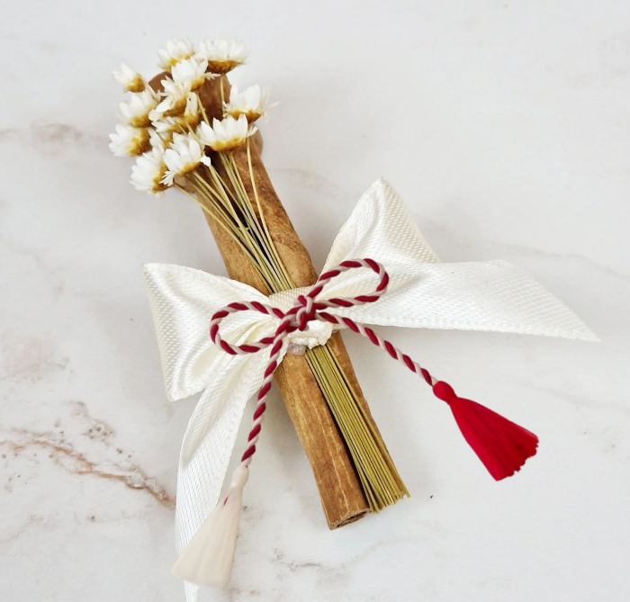 Martisor - Un baton delicios de scortisoara PARFUMATA decorat cu un buchetel de GLIXIA naturala uscata reprezinta cu siguranta o alegere inteleapta spre a fi oferita celor invitati la eveniment.