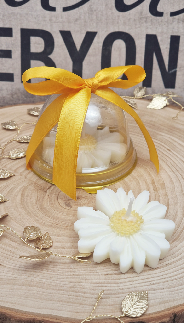 Surprinde-ți invitații cu o marturie speciala - o mini lumânare din ceara soia in forma de margareta, personalizata si ambalata elegant intr-o cutiuta transparenta in forma de cupola.