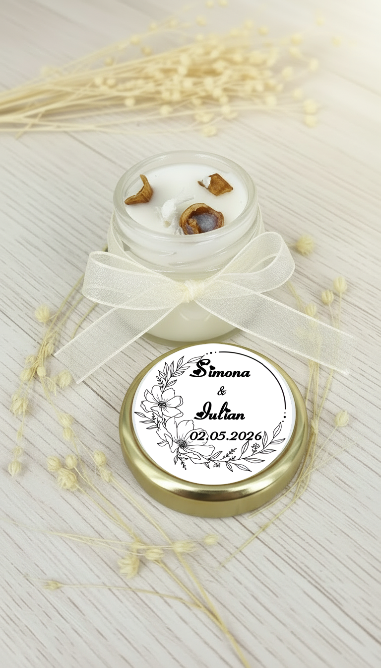 Marturie botez lumanare parfumata din ceara naturala de soia in borcanel de sticla.