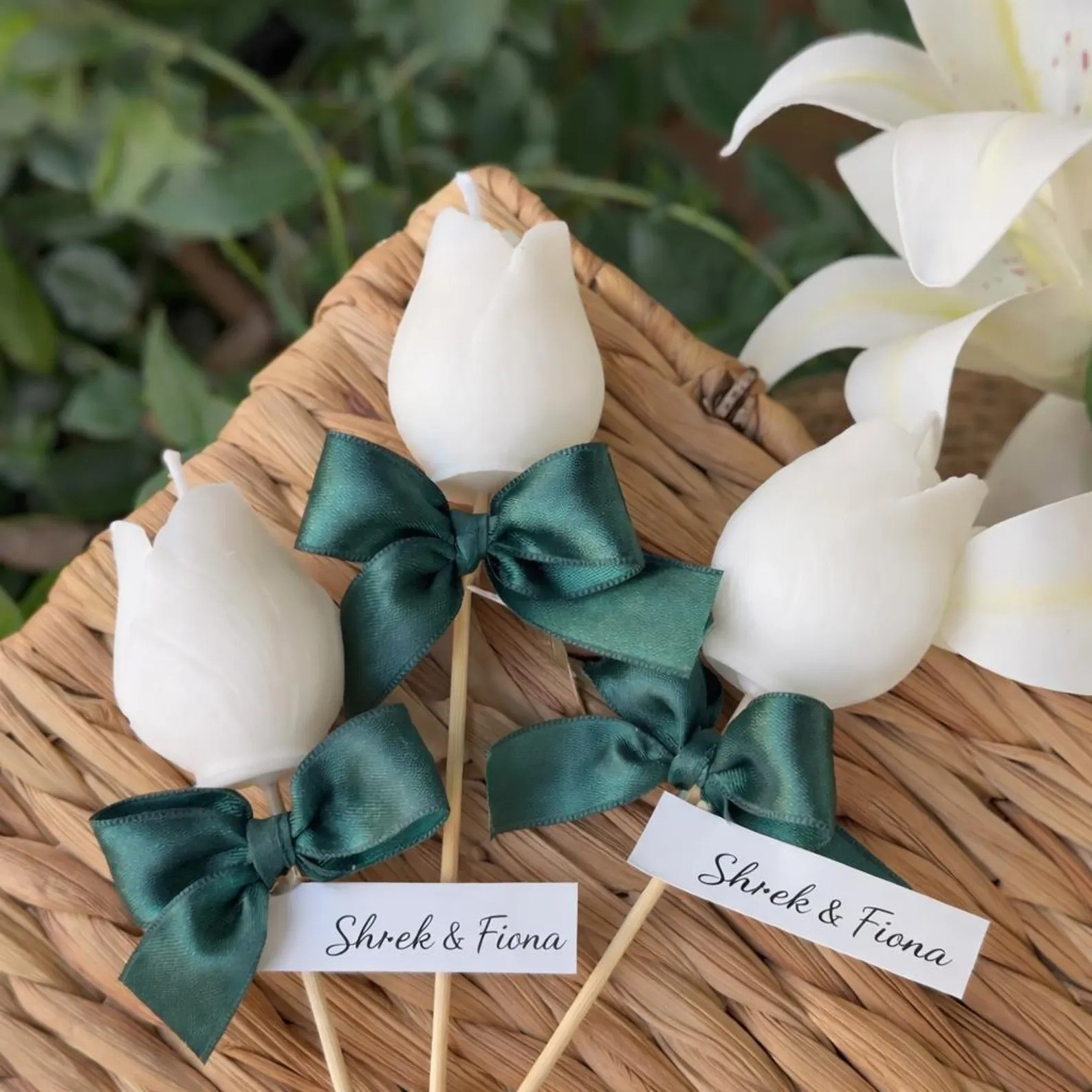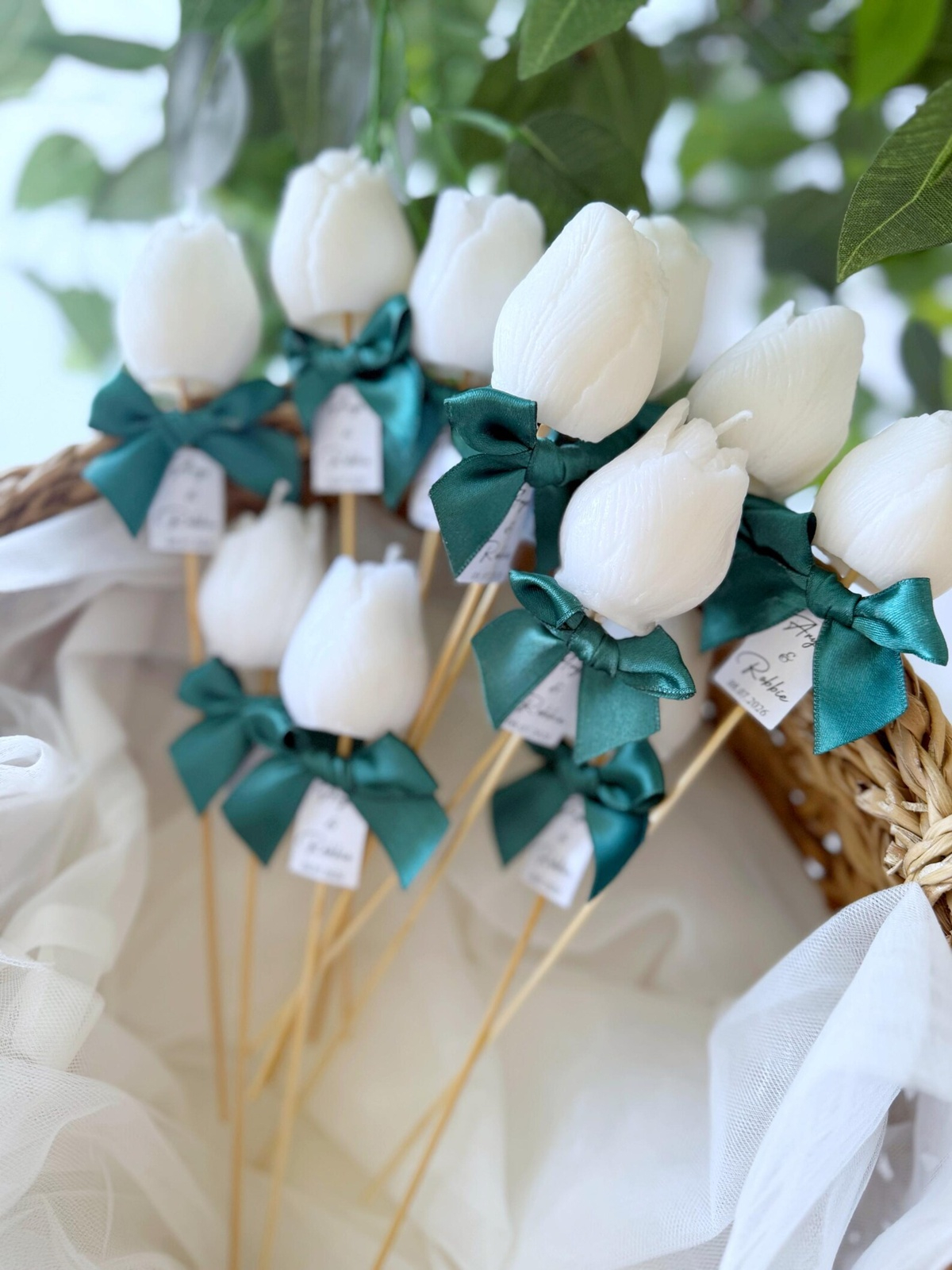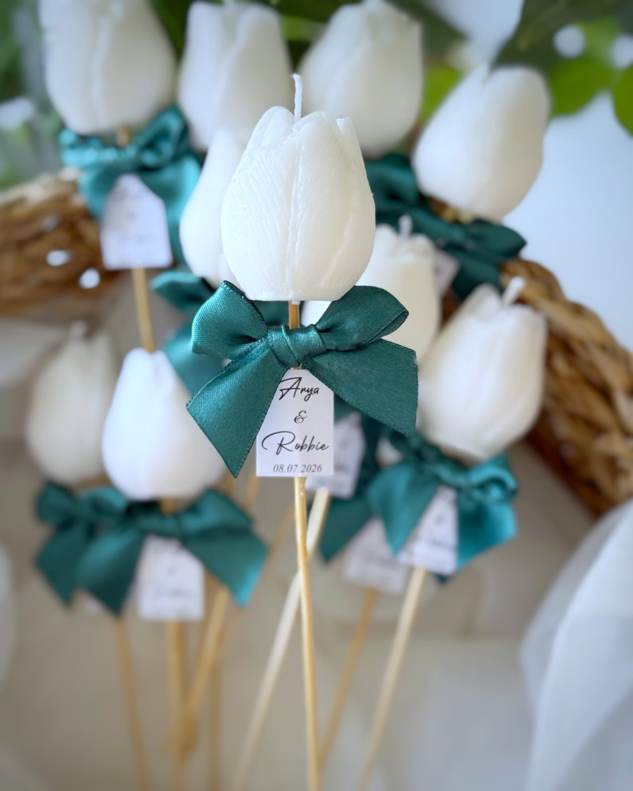 mărturii nunta lumanare in forma de o delicata LALEA, turnată manual din ceară de soia cu fitil din bumbac organic.Surprinde-ți invitații cu o marturie de NUNTĂ speciala - o lumânare în formă de floare din ceara soia personalizata