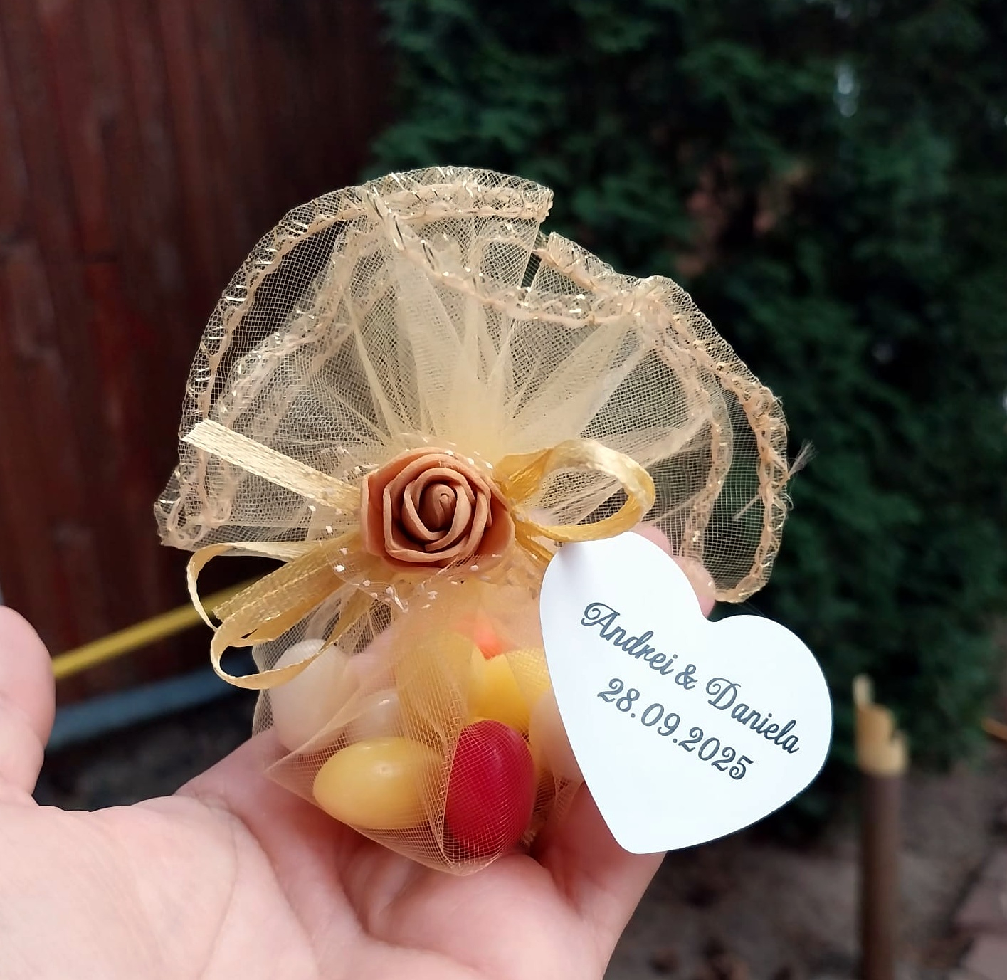 Fiecare colet va contine saculetii cu drajeuri legati exact ca in imagine, etichetele si dublu adezivul.