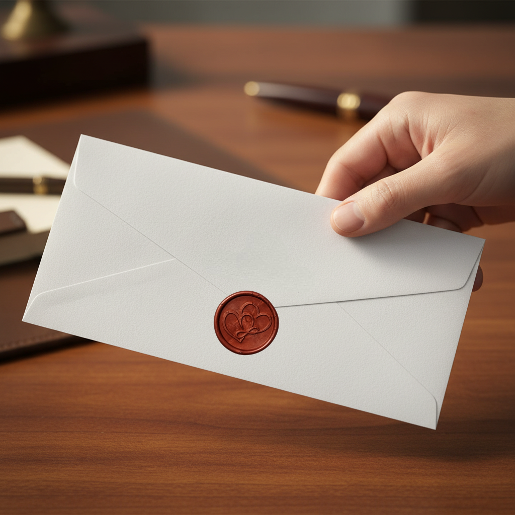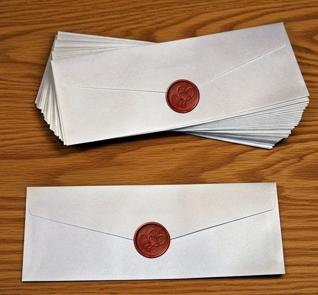 Plic realizat din carton alb  sidefat accesorizat cu un sigiliu de ceara naturala.