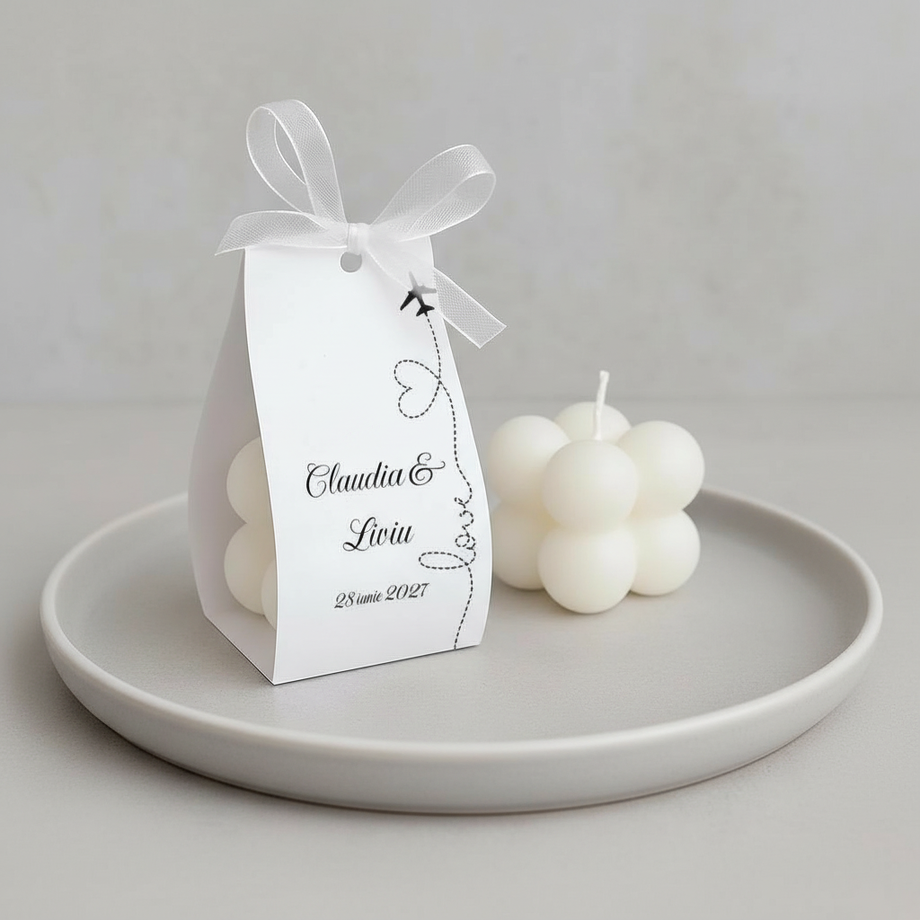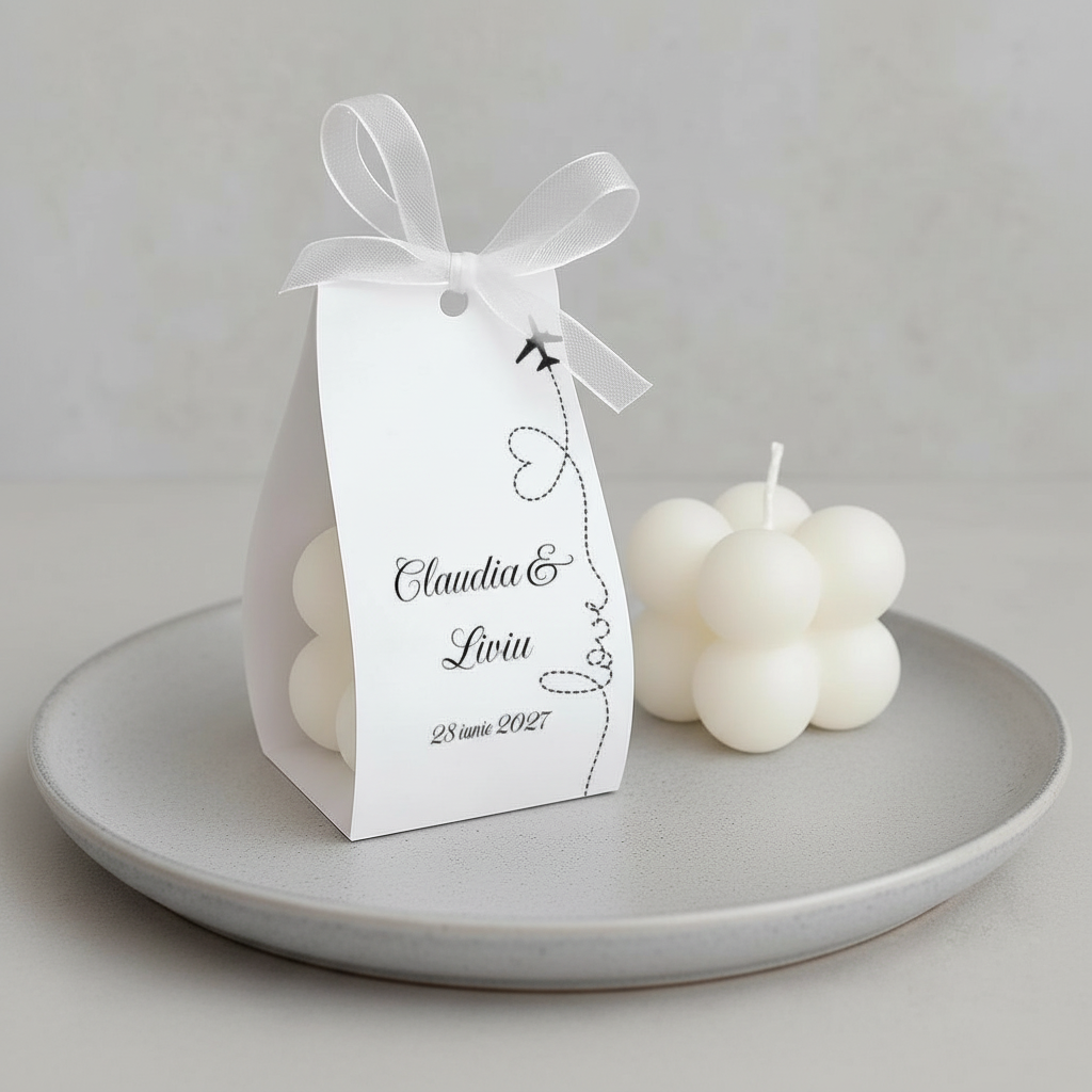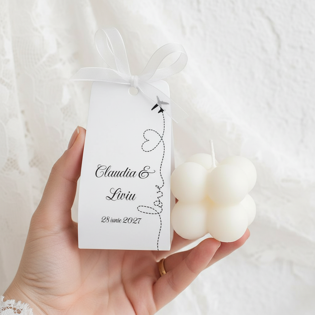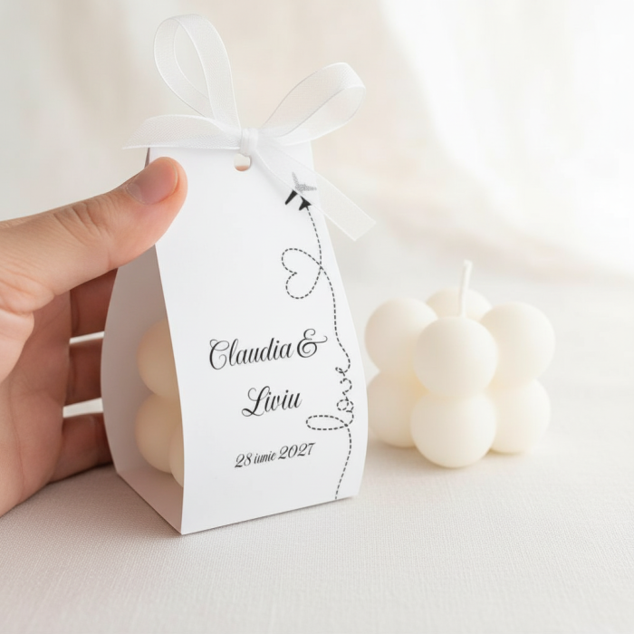 Ambalajul din carton adaugă un plus de rafinament și poate fi personalizat cu numele mirilor, data evenimentului si un mesaj de multumire