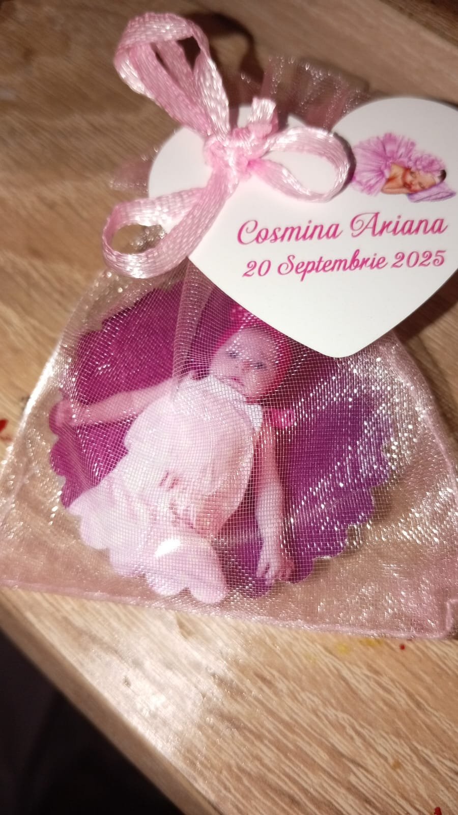 Marturie pentru botez - un sapunel rotund cu aroma de strugure (gramaj 15g) personalizat cu poza bebelusului intr-un saculet de organza