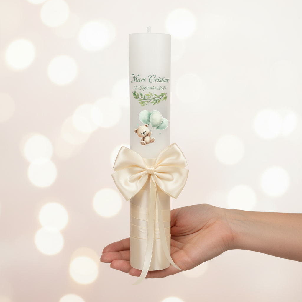 Lumanare de botez originala, imprimata cu un un Ursulet cu baloane verzi si personalizata cu numele copilului si data botezului.